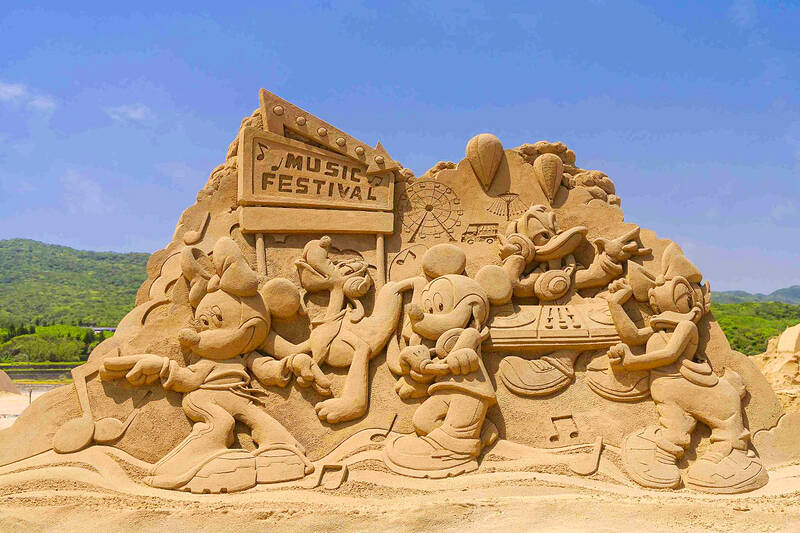 A sculpture is pictured yesterday at the Fulong International Sand Sculpture Art Festival on Fulong Beach in New Taipei City’s Gongliao District. The theme of the event, which began yesterday and is to run through Sept. 30, is Disney Summer Funfest. It includes 45 pieces featuring Disney characters from Mickey Mouse to princesses.