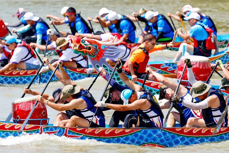People paddle in a dragon boat race prior to the celebration of the Dragon Boat Festival in Taipei yesterday. This year’s Dragon Boat Festival is today and falls on the fifth day of the fifth month in the Chinese lunar calendar in honor of Qu Yuan, an ancient Chinese poet and statesman.