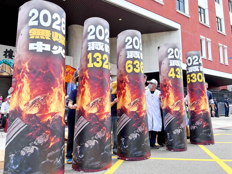 Environmental groups and members of the public hold up large posters in front of the Legislative Yuan in Taipei yesterday. They were calling on legislators to support a motion to eliminate the use of coal at the Taichung Power Plant by 2028, proposed by Chinese Nationalist Party (KMT) Legislator Lo Ting-wei and Taiwan People’s Party Legislator Chang Chi-kai.
