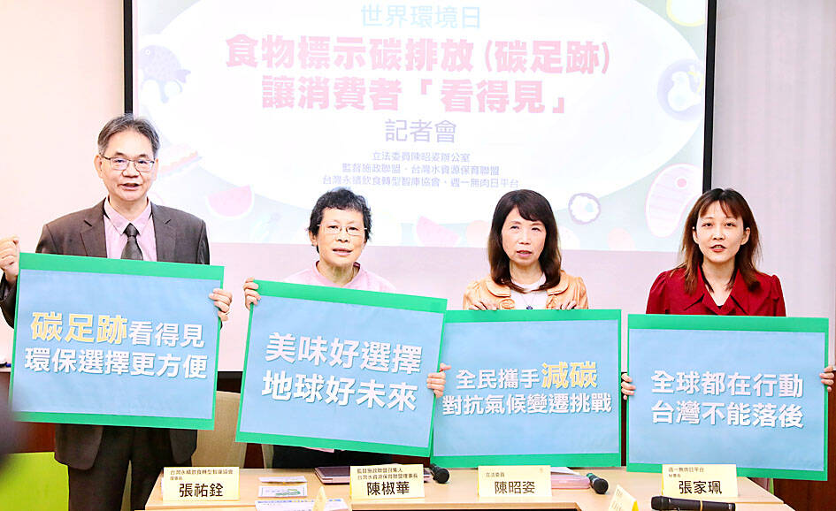 Taiwan People’s Party Legislator Chen Gau-tzu (陳昭姿) convened a news conference along with sustainability group representatives, calling on the government to extend carbon labels to all food products sold in supermarkets and restaurants in line with global trends.