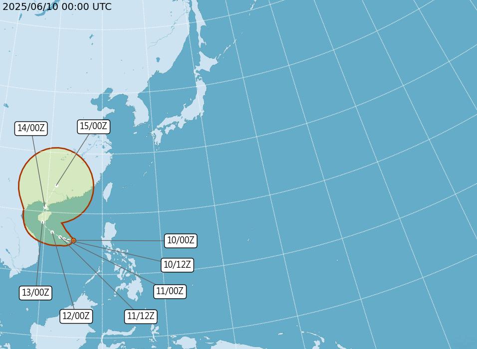 According to CWA data, as of 8am, the center of the tropical depression was about 940km southwest of Cape Oluanpi (鵝鑾鼻), Taiwan southernmost point, moving westward at a speed of 7kph.