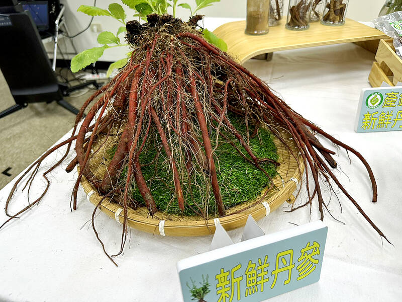 The Miaoli County Government and the station began to promote contract farming of red sage root in 2021, with the Yuanli Township Farmers’ Association assisting a production and marketing group with the branding “Miaoli’s Red Sage Roots,” as well as creating processed red sage root products, Lu said.