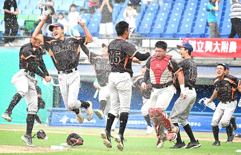 Players of the baseball team representing Taichung celebrate winning the Yushan Cup National Youth Baseball Championship at the Sinjhuang Baseball Stadium in New Taipei City yesterday. Taichung defeated New Taipei City 9-6 in the final.
