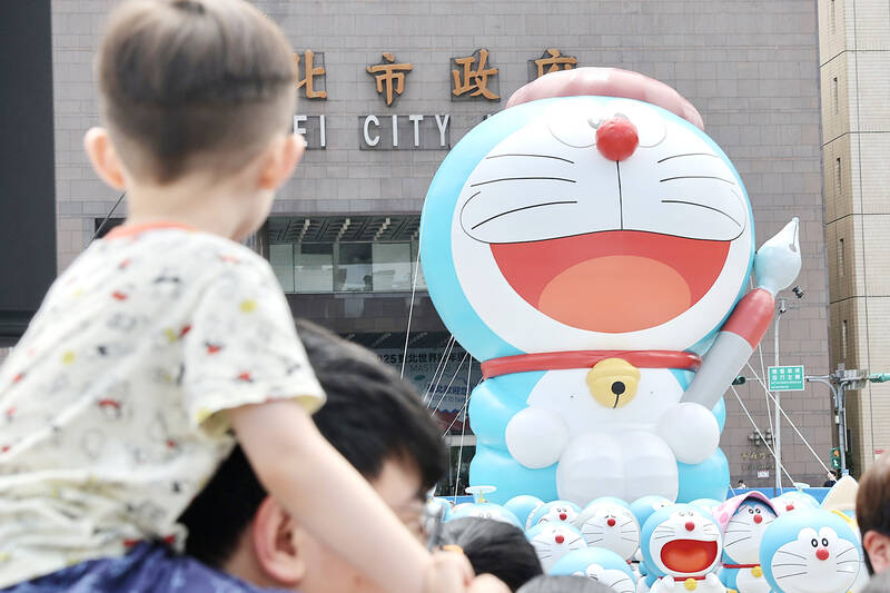 A child looks toward inflatables of Doraemon, an earless Japanese cartoon cat from the future, in front of the Taipei City Council yesterday during a preview of the official opening of the “100% Doraemon & Friends” exhibition at Huashan 1914 Creative Park in Taipei’s Zhongzheng District. The exhibition opens on June 28 and runs through Oct. 6.