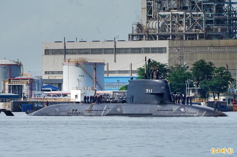 At 8am today, the submarine was seen leaving Kaohsiung’s Cijin Island (旗津), escorted by a pilot vessel and other units that exercise control of the sea zone.