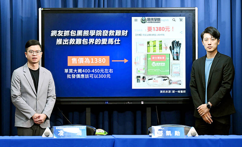 The Chinese Nationalist Party (KMT) yesterday criticized Kuma Academy for pricing its disaster prevention kit at NT$1,380 (US$46.59), calling the kit a luxury item that the organization is using to capitalize on escalating tensions across the Taiwan Strait.