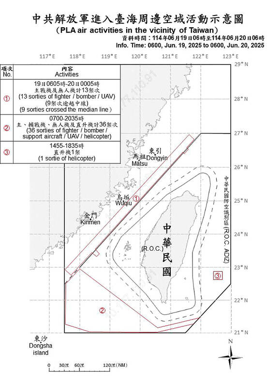 China sent 74 warplanes toward Taiwan between late Thursday and early yesterday, 61 of which crossed the median line in the Taiwan Strait.