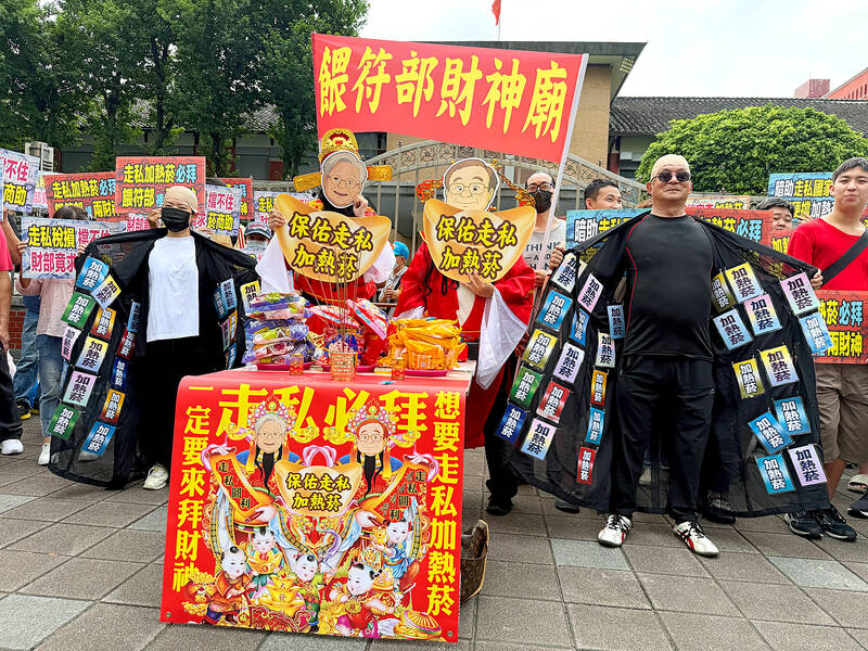 Alliance members also put on a street theater performance, with two men dressed up as the “God of Wealth” (財神爺) — each wielding a large gold ingot to symbolize government officials colluding to benefit big businesses selling paper cigarettes — and two men representing smugglers, pretending to hide HTPs inside their jackets.