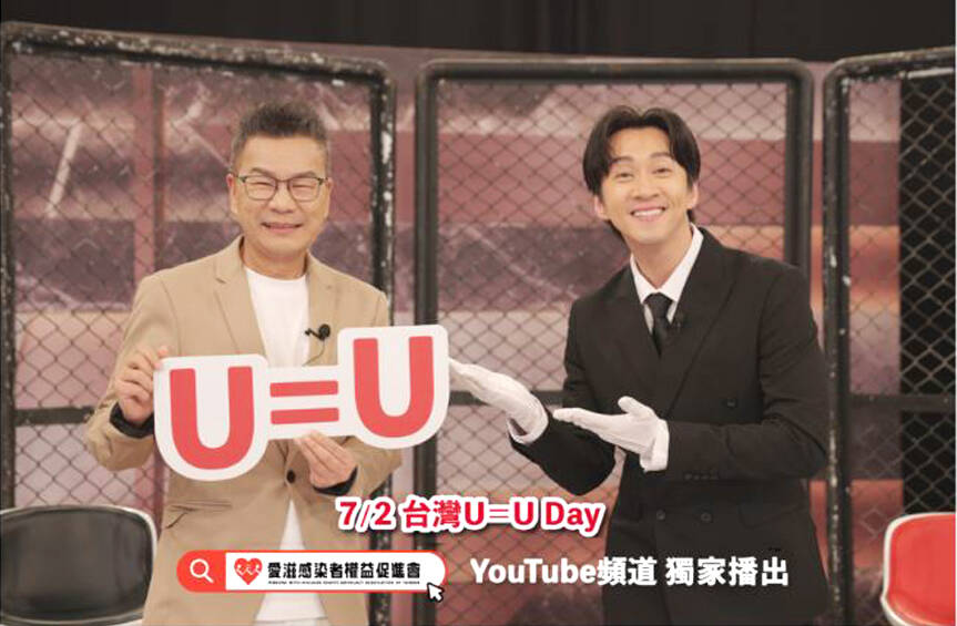 TV entertainers William Shen (沈玉琳) and Hank Chen (陳漢典) starred in a promotional video, which is inspired by a real-life story of an individual who achieved U=U, but was asked by their partner’s mother to break up their relationship out of fear of HIV, she said, adding that it would help the public understand U=U and remove stigma.