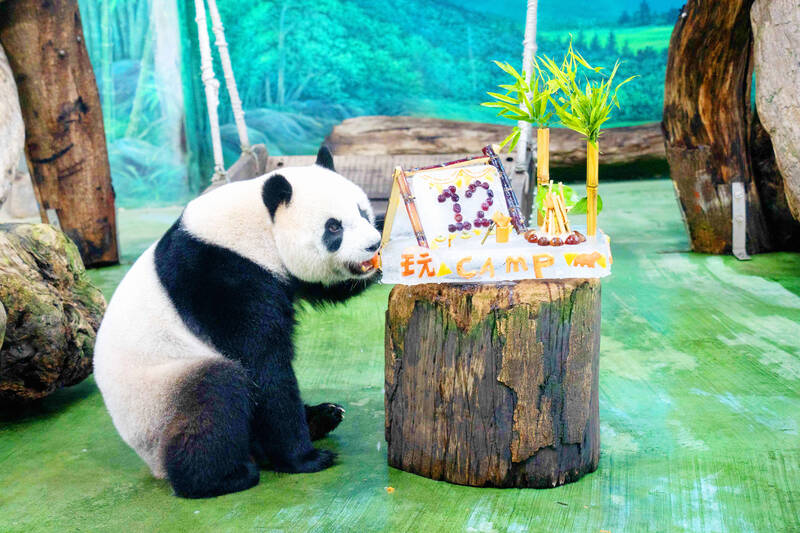Panda Yuan Zai chomps on a carrot from her camping-themed birthday cake for her 12th birthday at Taipei Zoo yesterday. The cake was made by zookeepers using bamboo, bamboo shoots, carrots, sugar cane, pineapples and kiwis to create a tent, a campfire, an ax on a log and a hammock, with grapes arranged in the shape of “12.”