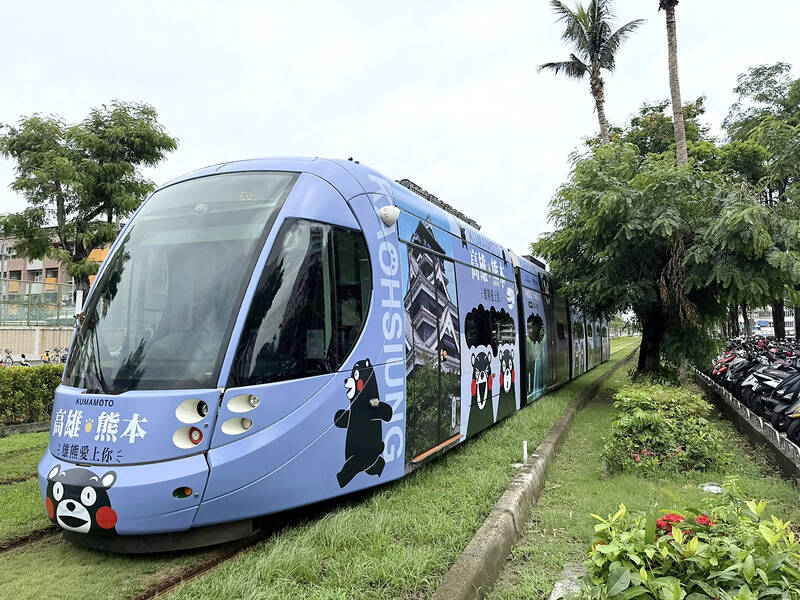 A light rail train featuring Kumamon, the mascot of Japan’s Kumamoto Prefecture, rides through Kaohsiung yesterday. The train was launched to promote direct flight services between Kaohsiung and Kumamoto, which are to increase to four flights per week.