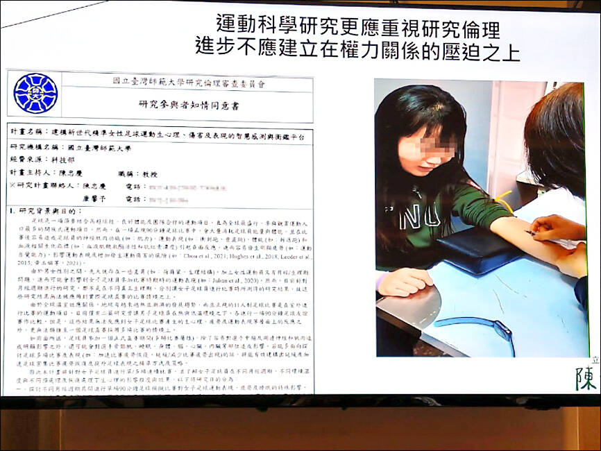 In November last year, Democratic Progressive Party (DPP) Legislator Chen Pei-yu (陳培瑜) said that a coach on the NTNU women’s soccer team was forcing players to cooperate with a sports science research project.