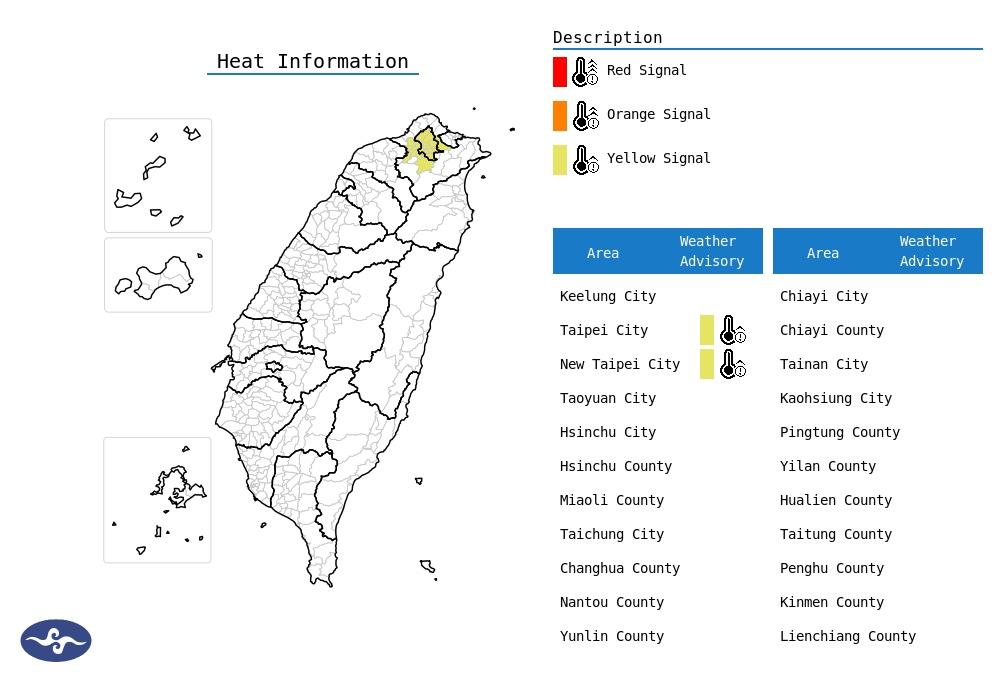 The Central Weather Administration (CWA) issued a heat advisory for the greater Taipei area today due to the effects of a warm southwesterly wind system, while rain is expected in central and southern Taiwan.