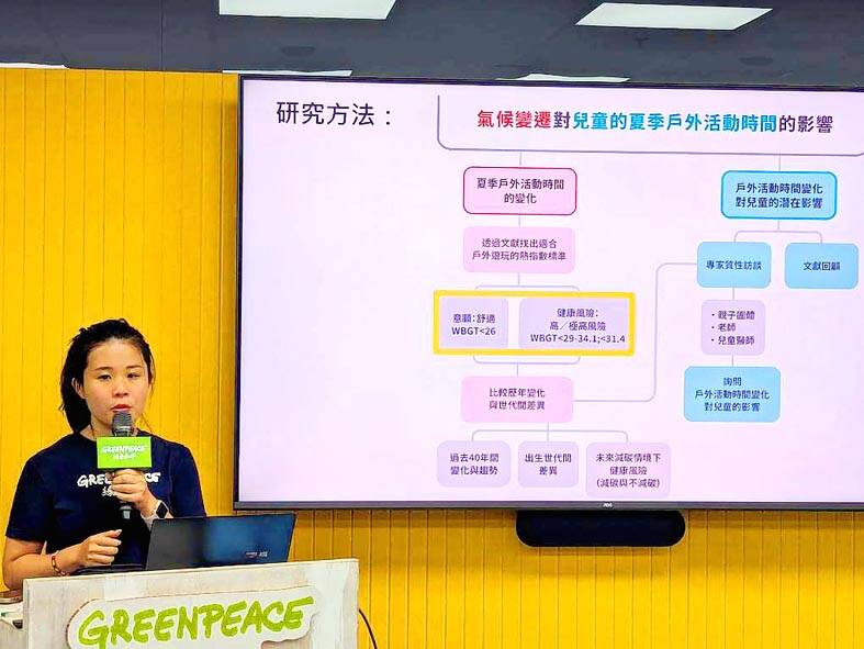 Greenpeace examined summer temperatures in Taipei, New Taipei City, Taoyuan, Hsinchu City, Taichung, Tainan and Kaohsiung to determine the effects of high temperatures and climate change on children’s outdoor activities, citing data garnered by China Medical University, which defines a wet-bulb globe temperature (WBGT) of 29°C or higher as posing the risk of heat-related injury.