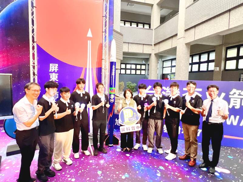 Pingtung Country Commissioner Chou Chun-mi, center, holds a placard alongside finalists at the Taiwan Cup Rocket Flight Competition at a news conference in Pingtung County yesterday. The competition is to take place in Hsu Hai Village in the county’s Mudan Township from July 25 to 27.