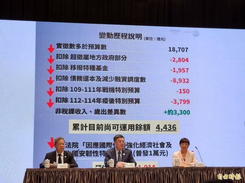 After subtracting NT$280.4 billion allocated to local governments, NT$195.7 billion legally allocated to special funds, almost NT$900 billion used to reduce debt, NT$15 billion for the new fighter jet special budget and NT$379.9 billion budget for the post-pandemic recovery plan, plus adding non-tax revenue and expenditure differences of NT$330 billion, the usable surplus is just NT$443.6 billion, he said.