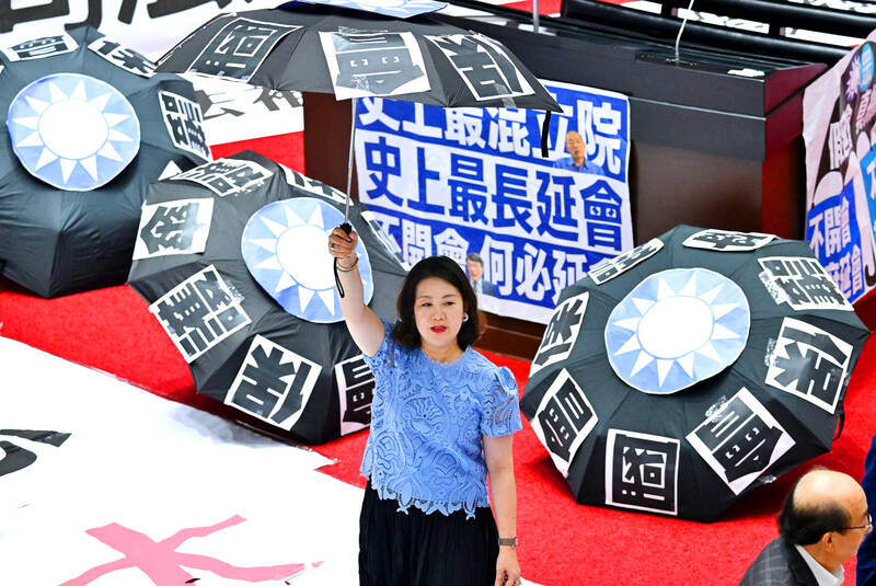 However, DPP caucus chief executive Rosalia Wu (吳思瑤) called the extension “groundless” and accused the opposition parties of using the prolonged session as their “legislative umbrella.”