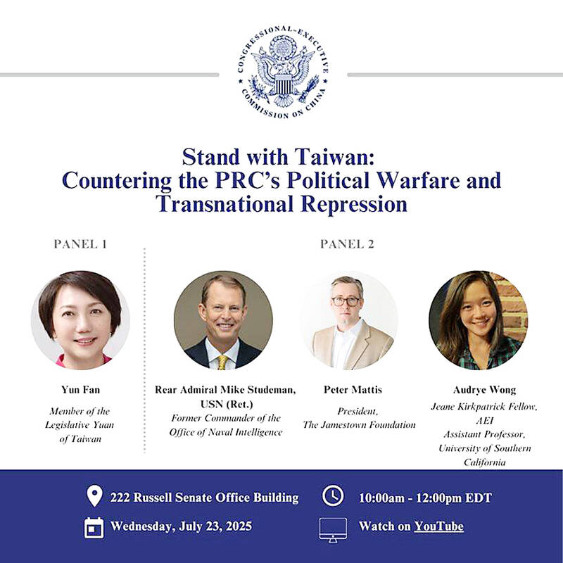 The hearing would highlight Beijing’s use of transnational repression and political manipulation to interfere in Taiwan’s democracy and explore feasible countermeasures by international partners, it says.