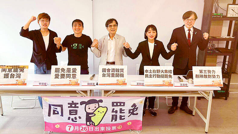 At a news conference in Taipei, representatives from parties including the New Power Party (NPP), the Green Party Taiwan and the Taiwan Obasang Political Equality Party rallied under slogans such as “Recall vote is for love,” “Clean up our legislature, Taiwan needs a reboot” and “Vote to remove those colluding with an enemy state.”