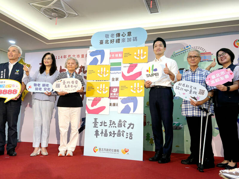 Taipei Mayor Chiang Wan-an, third right, gestures at a news conference announcing an increase in cash handouts for the elderly to NT$3,000 from NT$1,500 at the Taipei Department of Social Welfare yesterday. Residents who are 85 to 95 years old are eligible for the sum and can participate in a raffle via Senior Citizen Cards or EasyCards.