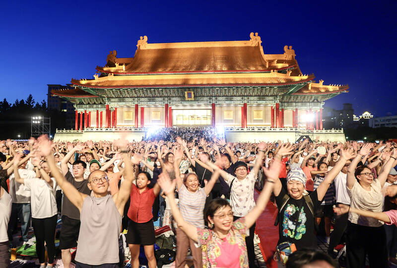 People follow Cloud Gate Dance Theatre performers, not pictured, through exercises before the Cloud Gate Outdoor Performance event last night at the plaza in front of the National Theater and National Concert Hall in Taipei. The event celebrated the 30th anniversary of Cathay Financial Holdings Co’s support of the performing arts group.