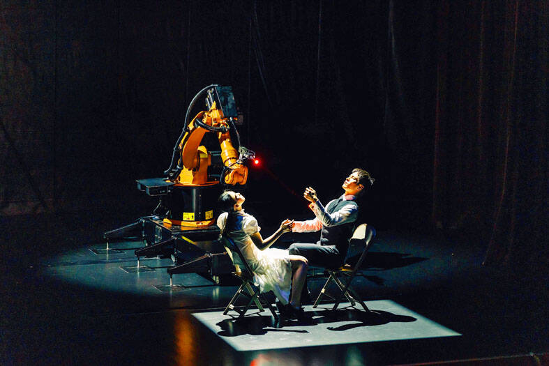 Taiwanese choreographer Huang Yi (黃翊) and his industrial robot “Kuka” debuted in Japan on Sunday with a human-machine dance performance, as part of the “We Taiwan” exhibition at the Kansai Expo in Osaka.