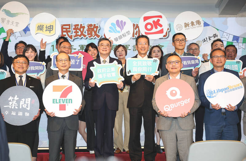 Premier Cho Jung-tai, front, third left, Minister of National Defense Wellington Koo, front, third right, and others hold placards at a news conference in Taipei yesterday. Businesses at the event pledged to offer discounts and other preferential treatment to honor military personnel on Armed Forces Day on Sept. 3.