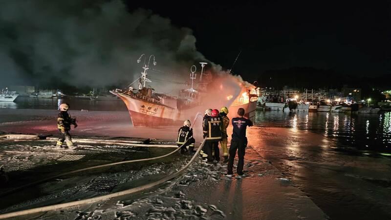 Firefighters received a report at 9:32pm that the vessel, registered at Shenao Fishing Port (深澳漁港) in New Taipei City's Rueifang District (瑞芳), was burning about 200m from shore.