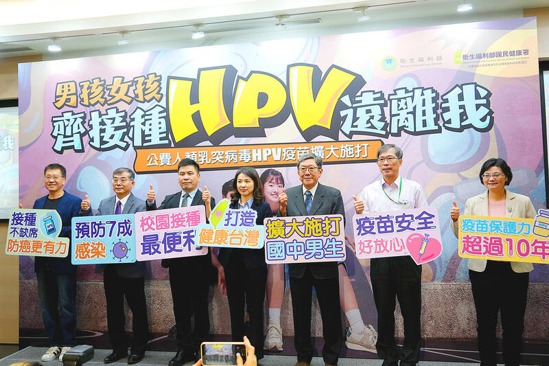 Male junior-high school students would be eligible for free human papillomavirus (HPV) vaccinations starting next month, extending the program for girls and making Taiwan the first country in East Asia to offer boys the full two-dose series.