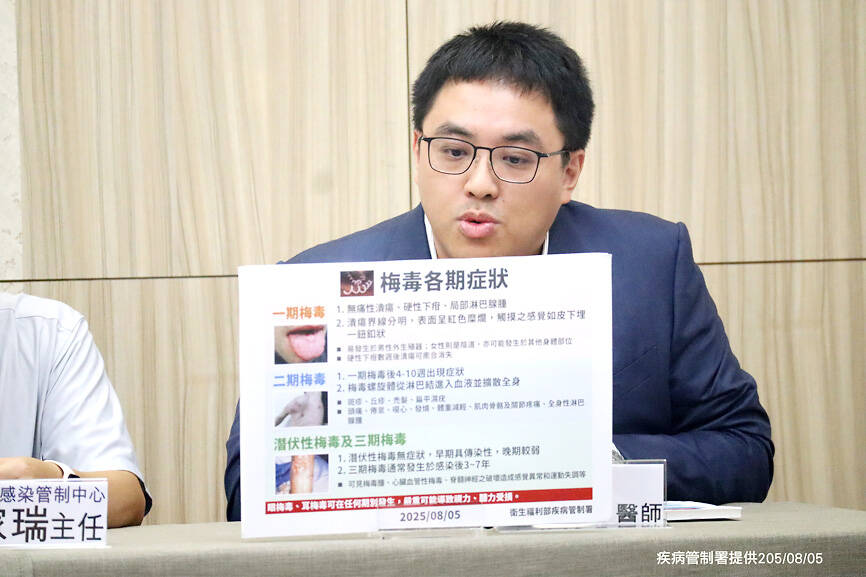 The case was shared at the Centers for Disease Control (CDC) on Tuesday last week by Yang Chia-jui (楊家瑞), director of Far Eastern Memorial Hospital’s Department of Infectious Diseases, while the centers announced the publication of the “Guidelines for the Clinical Diagnosis, Treatment and Prevention of Syphilis in Adults in Taiwan.”
