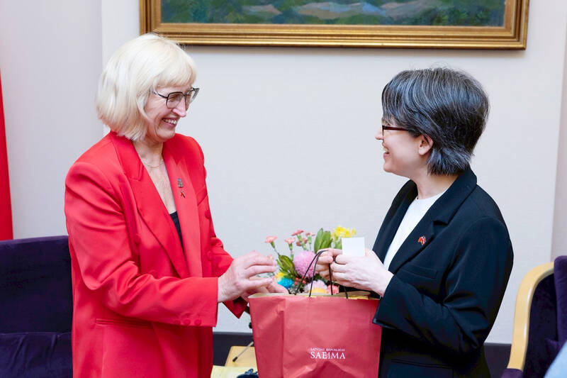 Vice President Hsiao Bi-khim, right, greets Latvia-Taiwan Parliamentary Friendship Group chairwoman Ingrida Circene at the Presidential Office in Taipei yesterday. Hsiao welcomed a delegation of Latvian parliamentary members from the group to Taiwan, and thanked them for their friendship and support, as well as thanking the people of Latvia for their continuous support for Taiwan’s meaningful participation in international affairs.