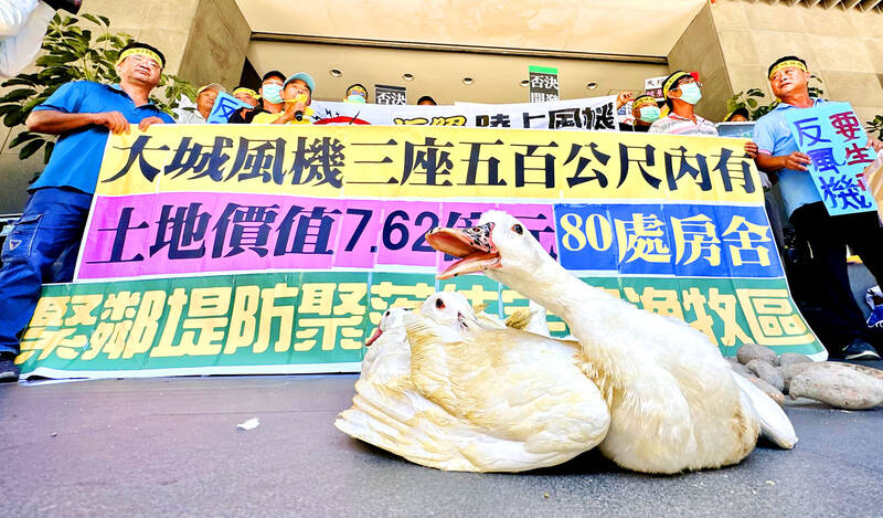 Representatives from Changhua County’s Dacheng Township (大城) yesterday gathered in front of the Ministry of Environment in Taipei to protest a construction project that aims to install three onshore wind turbines near local private residences and aquaculture farms, urging the environmental impact assessment (EIA) committee to veto the project.