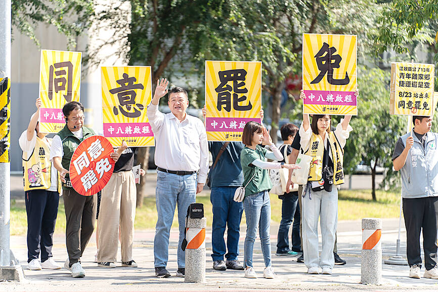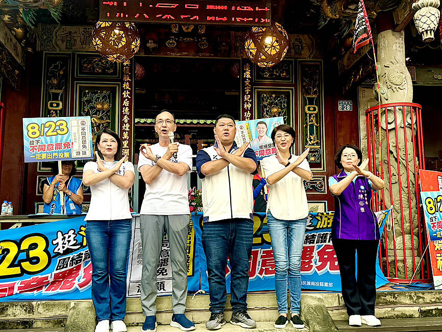 In Nantou County, DPP acting secretary-general Ho Po-wen (何博文) led party officials in a street canvassing effort to garner support for the recall of KMT Legislator Yu Hao (游顥) in the Aug. 23 vote.