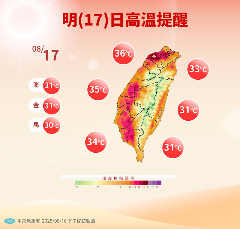 The CWA also issued a “yellow” warning for Hsinchu City, and Hsinchu and Miaoli counties in the north, and Pingtung County in the south, meaning temperatures could reach or exceed 36°C.