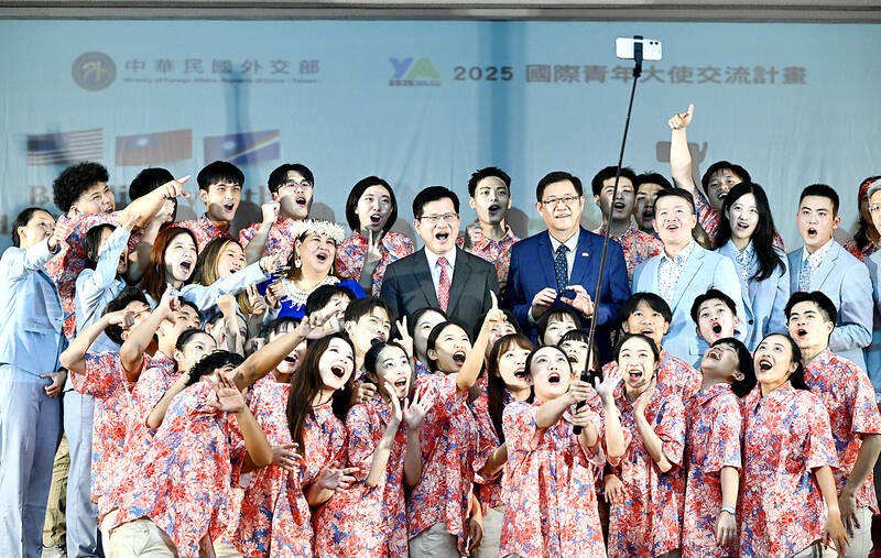 Minister of Foreign Affairs Lin Chia-lung, third row, sixth left, Marshall Islands Ambassador to Taiwan Anjanette Kattil, third row, fifth left, and Department of NGO International Affairs Director Charlie Chiang, third row, seventh left, take a selfie with youth ambassadors at a flag presentation ceremony at the Ministry of Foreign Affairs in Taipei yesterday. Forty youth ambassadors familiar with Taiwanese indigenous cultures are to depart tomorrow on a 12-day trip to the Marshall Islands, Hawaii and Guam to reinforce Taiwan’s ties with Pacific allies.