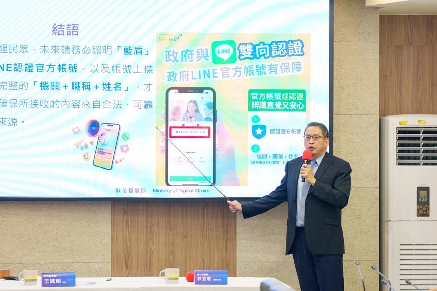 To support the initiative, Wang said the ministry would establish a system to authorize agencies to apply for "blue shield" accounts, while Line would also set up a separate verification mechanism to cross-check application data with MODA.