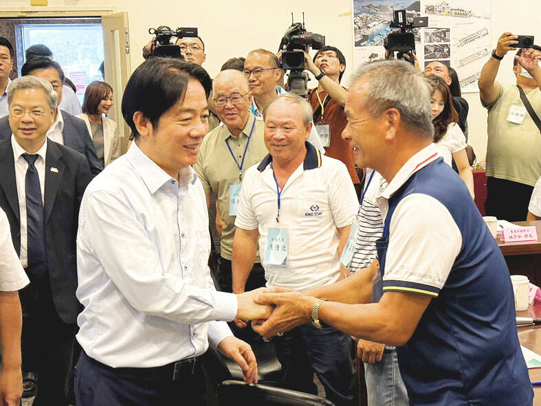 President William Lai (賴清德) on Friday visited Yilan County’s Suao Township (蘇澳) to inspect the mahi-mahi industry and meet with fisheries operators affected by the new 20 percent US tariff, pledging that the government would support fisherfolk and farmers through the impact.