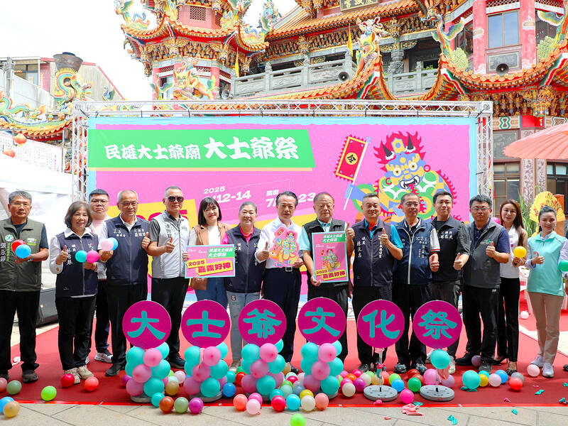 Chiayi Commissioner Weng Chang-lliang, center, and Dasiyeh Temple president Chou Chang-yen, seventh right, and others pose at a news conference for the annual Minsyong Dasiyeh Festival on Sept. 12. The event marks the start of the Ghost Month, as it is said that the Guanyin bodhisattva, also known as Da Si, once walked the streets of Minsyong on the seventh month of the lunar calendar to calm the ghosts that visited the realm of the living.