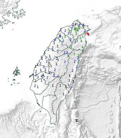 It measured 3 in other areas of Yilan and Taipei, as well as in New Taipei City, Taoyuan, and Hsinchu, Hualien, Miaoli and Nantou counties, the agency said.