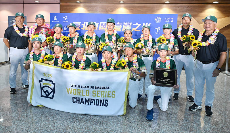Players and coaches from Taipei’s Dong Yuan Elementary School pose for a photograph after being welcomed with flowers upon their return to Taiwan last night. The players defeated a team from Las Vegas 7-0 to win the Little League World Series in South Williamsport, Pennsylvania, on Sunday last week, Taiwan’s first Little League crown in 29 years, and Dong Yuan’s first since 1972.