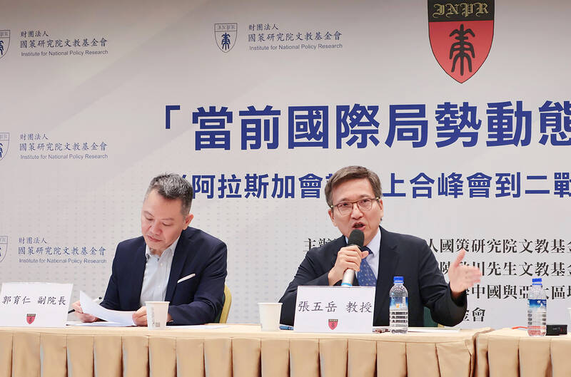 Chang Wu-ueh (張五岳), an associate professor in Tamkang University’s Graduate Institute of China, made the remarks at a forum in Taipei on strategic implications for Taiwan following the US-Russia Summit in Alaska, the Shanghai Cooperation Organization Summit in Tianjin, China, and the military parade in Beijing.