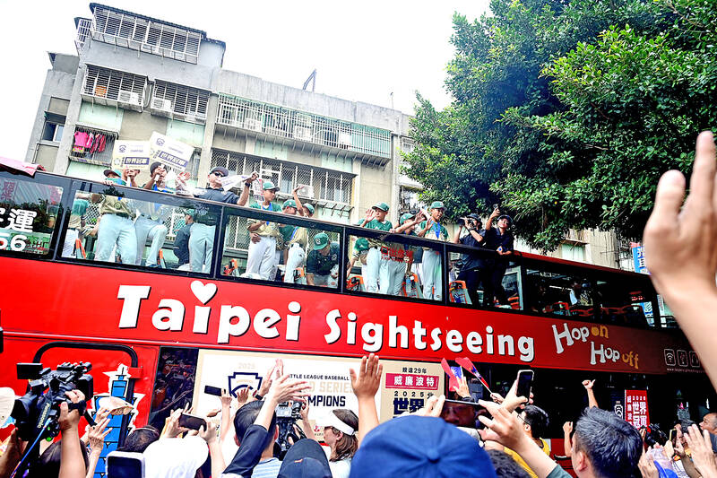 Players and coaches from Taipei’s Dong Yuan Elementary School wave to onlookers during a parade on a Taipei street yesterday celebrating their Little League Baseball World Series title victory. It was Taiwan’s first Little League crown in 29 years, and Dong Yuan’s first since 1972.