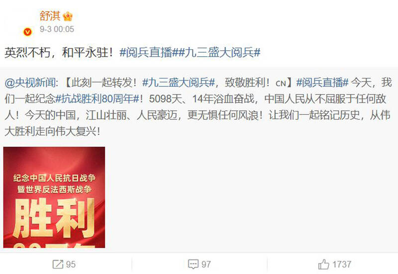 Nevertheless, on Wednesday last week when the CCP staged a massive military parade in Beijing, some entertainers, including musician Ouyang Nana (歐陽娜娜), actress Shu Qi (舒淇) and actor Wu Kang-ren (吳慷仁), touted “China’s victory over Japan in World War II,” using more “euphemistic” language, without advocating directly for the forceful annexation of Taiwan.