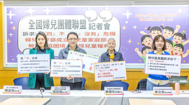 The alliance said that children in Taiwan are facing five key issues: They “cannot live,” as the mortality rate for children younger than five is higher than in neighboring countries and the youth suicide rate continues to rise; they “cannot smile,” as parents struggle to spend quality time with their children; they “cannot learn,” due to insufficient family education and parental support; they “cannot be born,” as the birthrate has remained lower than the death rate for five consecutive years; and they “have no future,” as the lack of a dedicated government agency leaves children “marginalized by the system.”
