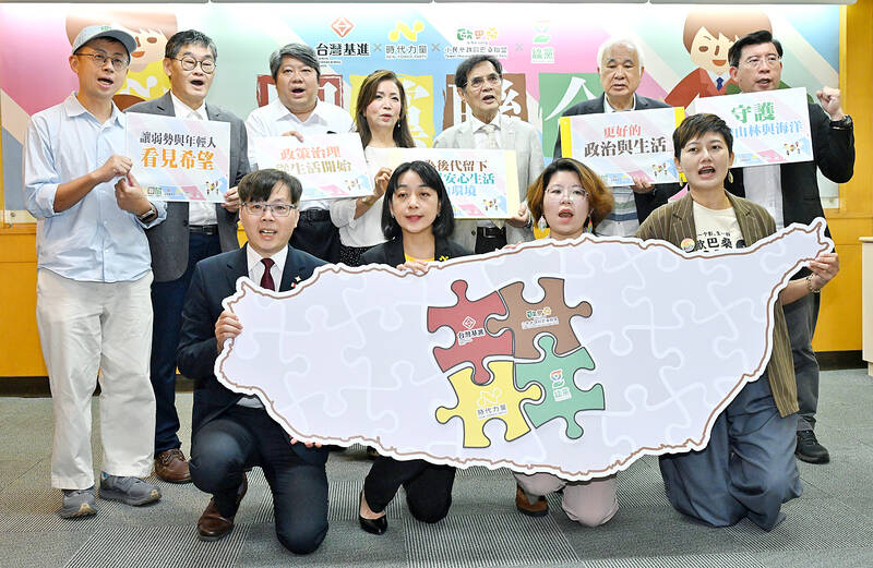 New Power Party (NPP) Chairwoman Claire Wang (王婉諭), Taiwan Statebuilding Party Chairman Wang Sing-huan (王興煥), Taiwan Obasang Political Equality Party convener Lin Shih-han (林詩涵) and Green Party Taiwan coconvener Joyance Wang (王彥涵) signed a joint declaration at an event in Taipei outlining shared principles, including defending Taiwan against Chinese aggression, boosting national defense and coordinating nominations to maximize local council seats.