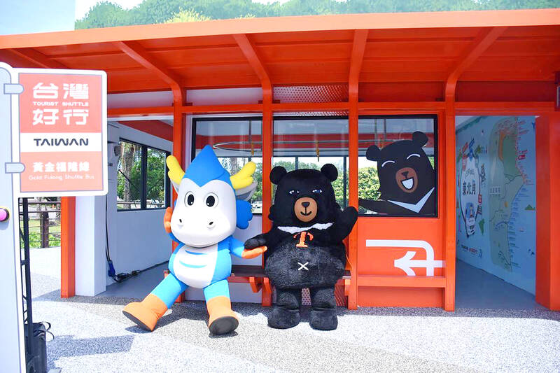 Northeast and Yilan Coast Scenic Area mascot Fortune Dragon, left, and Tourism Administration mascot OhBear pose at the Fulong bus shelter in New Taipei City yesterday, at an event launching the revamped structure. The bus stop is part of the agency’s push to promote the use of public transportation when visiting tourist attractions.