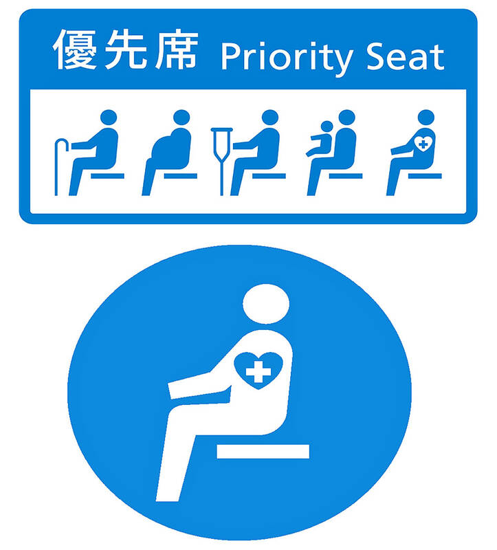 The new “priority seat” icon, above, which is to be posted on public transportation, is pictured in a graphic unveiled by the Ministry of Transportation and Communications yesterday. A new sticker, below, would also be available for the public to download and use if they have a need to use priority seating. An amendment passed in July required a change in signage from “courtesy seats” (博愛座) to “priority seats” (優先席) to ensure that anyone “with genuine need” may sit down.