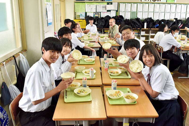 Students at Hofu Shiritsu Kokufu Junior High School in Yamaguchi, Japan, hold bowls of cooked Tainan No. 11 rice during lunch at school yesterday. As Japan is facing rice shortage and surging prices, several Taiwanese non-governmental organizations led by Indo-Pacific Strategic Think Tank chief executive officer Yaita Akio donated Taiwanese rice to 300 schools in Yamaguchi.