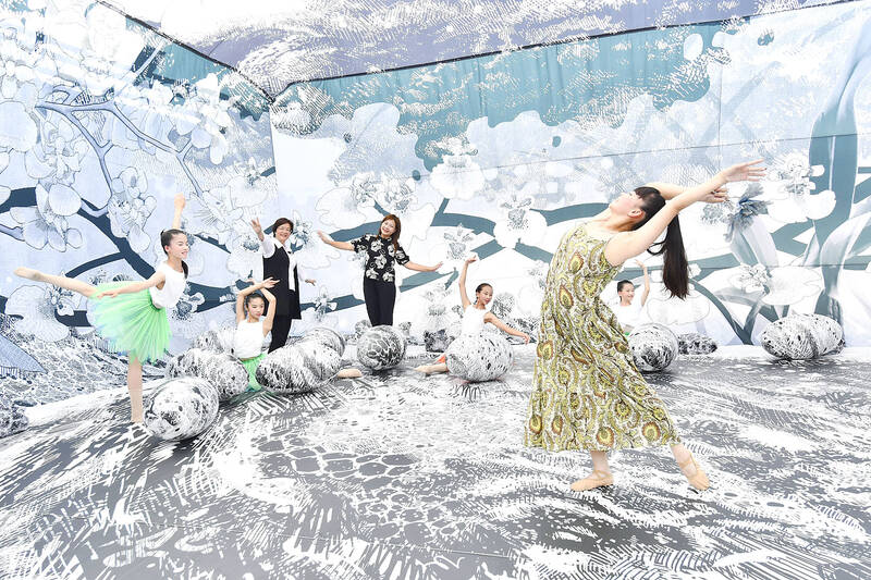 Changhua County Commissioner Wang Hui-mei, third left, and dancers pose in a flower art installation at a news conference at the Changhua Confucius Temple in Changhua County yesterday, to promote the installation during this year’s Changhua Walking Art Festival, to be held from Sept. 27 to Oct. 26.
