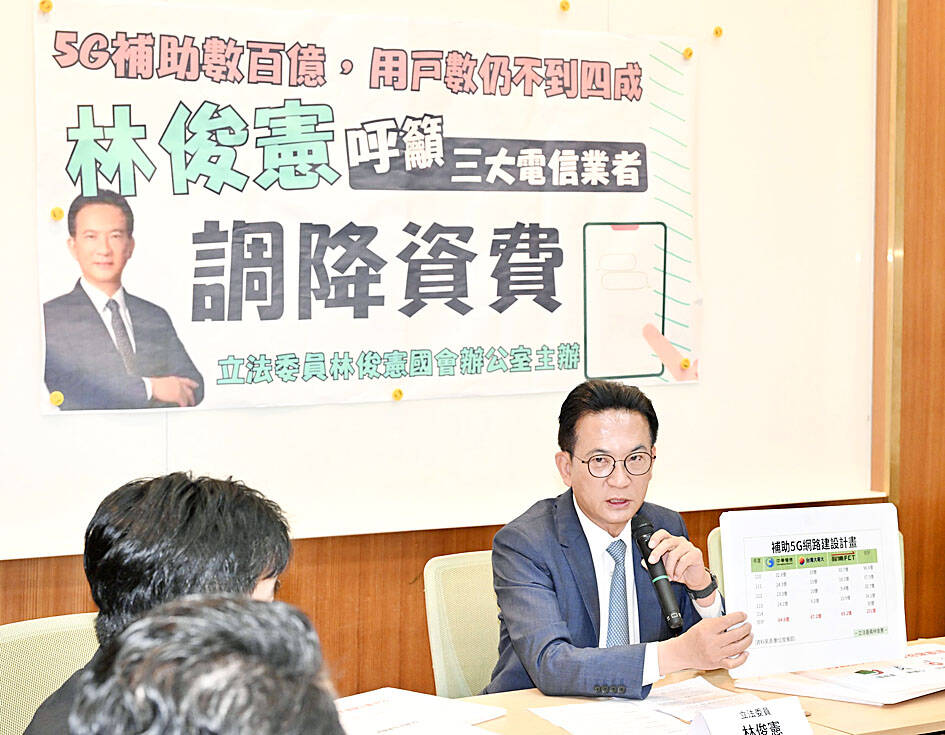 Democratic Progressive Party Legislator Lin Chun-hsien (林俊憲) at a news conference yesterday called on the nation’s three major telecoms to offer lower monthly charges, given that tens of billions of New Taiwan dollars were allocated to 5G development, but the user penetration rate has remained relatively low over the past five years.